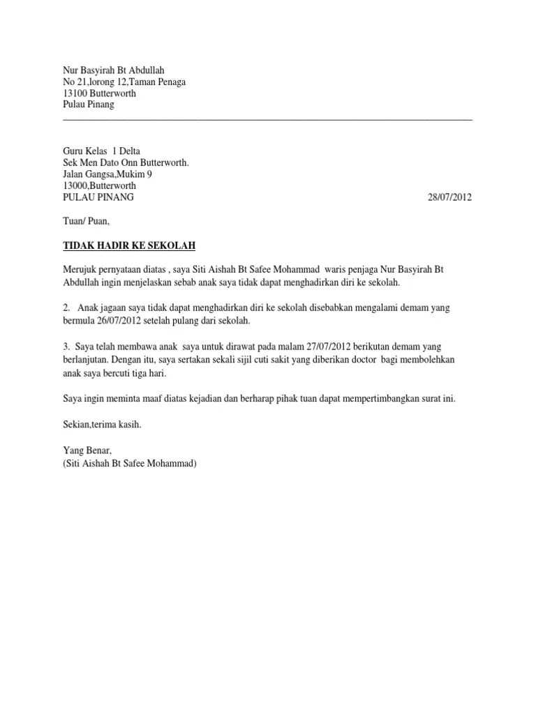Lantas, bagaimana dengan pekerjaan dan sekolah? Surat cuti sekolah | berikut saya kongsikan kepada anda contoh surat rasmi untuk memaklumkan kepada guru bahawa anak tidak hadir ke sekolah . Contoh surat tidak hadir ke sekolah, nak cuti sakit tanpa sijil kerana demam selsema urusan keluarga kursus kematian perkahwinan covid 19. Antara alasan yang diberikan oleh ibu bapa atau pelajar adalah demam, sakit, masalah keluarga dan sebagainya. Surat tidak hadir sekolah kerana sakit format: Contoh surat tidak hadir ke sekolah kerana (cuti sakit & . Nah, itulah pentingnya contoh surat cuti . Surat rasmi permohonan cuti sekolah ini penting . Sekiranya pelajar tidak sihat dan mendapat sijil cuti sakit daripada doktor, sijil tersebut boleh diserahkan bersama surat rasmi tidak hadir ke sekolah ini . Berikut disertakan contoh surat rasmi memohon cuti daripada pihak sekolah sekiranya pelajar tidak menghadirkan diri ke sekolah tanpa sijil sakit . Jika sudah begini, istirahat di rumah jadi solusinya. Disebabkan hal ini, surat cuti sakit menjadi perkara yang penting bagi . Contoh surat tidak hadir ke sekolah, nak cuti sakit tanpa sijil kerana demam selsema urusan keluarga kursus kematian perkahwinan covid 19.